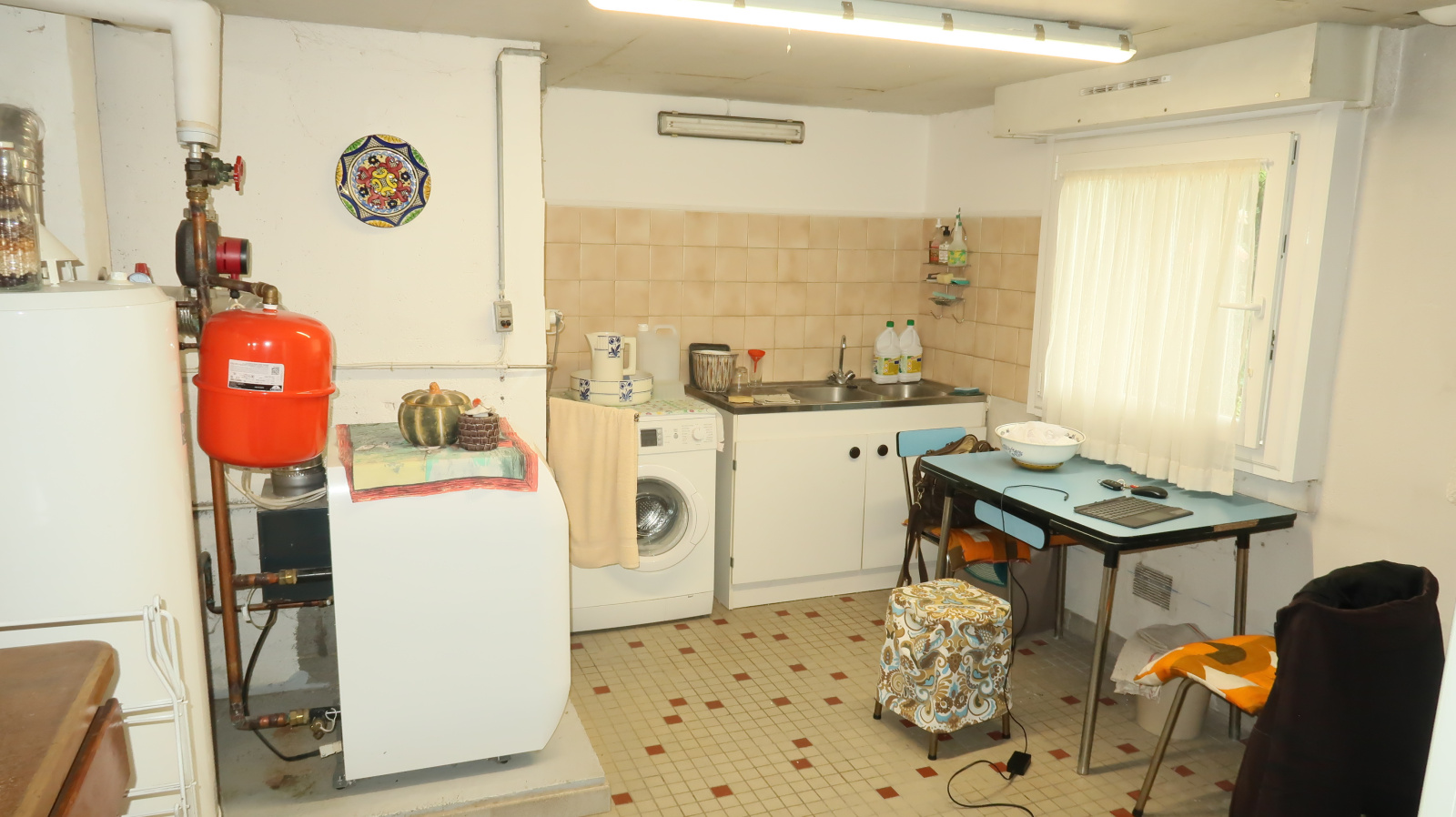 Rez de chaussée avec grand garage traversant avec accès jardin, 39 m², chaufferie lingerie cuisine d'été 13 m², cellier, studio avec son coin sanitaire 32 m².